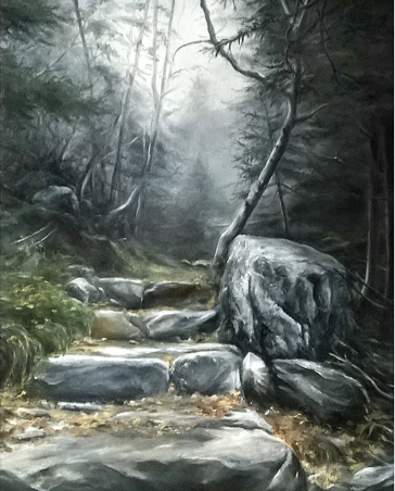 Tátra: olajfestmény, saját fotó alapján készült, sok túra, ködös idő adta hangulat, viszafogottabb színek.